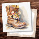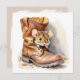 A cute little watercolor illustration with a mouse peeking out from an old brown boot. Blank card.