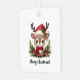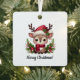 A cute little reindeer wearing a red Christmas hat is sitting on the ground surrounded by two fir tree branches decorated for Christmas. The reindeer is looking at you. The front of the ornament shows the words "Merry Christmas!". You can easily replace these words with words of your own choice.
