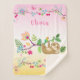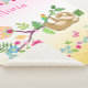 This is an original exclusive illustration, made by hand. This design has a soft pink and yellow background with lots of happy pink flowers and blue flowers. In the middle there is a very cute baby sloth hanging under a branch with tropical leaves. There is also a cute bird and a pink butterfly. You can add the name of the child on the blanket