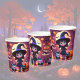 This Paper Cups features a cute little witch in a black costume with cats and pumpkins on Halloween night.