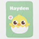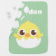 A cosy blanket with a cute little yellow chick just hatched and peeking out from the egg shell. It is saying I love you! Personalize with baby's name to make this a unique piece for the little one. Background colour can be changed. Gender neutral colour platette suitable for both baby boys and girls.