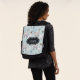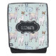 Personalized backpack with a cute pattern featuring whimsical llamas. One is laying down, one is holding a flower in his mouth, and one is looking at you suspiciously. These animals have lots of charming character. Set on a green polka dot background. Layered over top is a vintage fancy frame in black and white with your text inside.