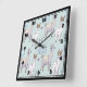 A square clock with a cute pattern featuring whimsical llamas. One is laying down, one is holding a flower in his mouth, and one is looking at you suspiciously. These animals have lots of charming character. Set on a green polka dot background.