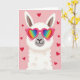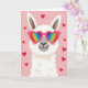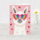 This greeting card shows a fluffy white llama filling most of the front, set against a light blush-pink background. The llama wears oversized hot-pink sunglasses shaped like hearts, with rainbow-colored lenses that stand out right away. Its cheeks have a soft rosy tint, and it has a small, closed-mouth smile that feels calm and sweet. Small cherry-red hearts float all around the llama, making the whole scene feel full of love 💘❤️. There isn’t any printed text on the card, so the picture does all the talking. The fur is drawn with soft, rounded edges that make the llama look cozy and huggable. It’s a simple, romantic design that works for a partner, friend, or anyone you adore 😘.