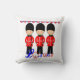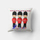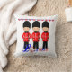 Such a cute throw pillow in red white and blue, London Themed with three little Buckingham Palace Guards standing in a row; under Union Jack Bunting flags and underlined by London text with the famous London Eye symbol. A very British fun and trendy picture.