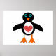 This poster features a cute cartoon of a penguin with big eyes, a small beak and cute little feet. The penguin has a big red love heart in the middle of its belly and wings wide open ready to give someone a big hug.