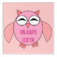 This awesome acrylic wall art features a cute cartoon of a pink owl with sleepy eyes, a small beak and cute little feet. There is bright pink text inside the owls tummy that says, “Owl Always Love you”. This is the perfect gift for showing someone special how much you love them.