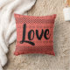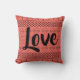 Cute geometric pattern throw pillow with the word Love in script. Black print on coral background.