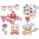 A cute collage of romantic, love themed stickers featuring love birds, teddy bear, bunny rabbit, balloon, heart and candy. In colors of red, pink and blue.