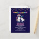 A whimsical and girly birthday party invitation. Designed with 2 cute unicorns with bright and colorful tails, and mane. A colorful rainbow with clouds on each side above their heads. Other elements include a little flower a heart and some stars. Along the top are colorful vibrant confetti dots. Just an image not actual confetti. A bunting banner stretches across the top. A dark purple background.
