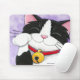 Cute Maneki Neko Lucky cat mousepad design. Cheerful black and white tuxedo cat sitting in a beckoning position associated with Japanese Maneki Neko Cats. He wears a red collar with a huge golden bell. Kitty cuteness for cat lovers. Would make a great gift for the home or office! Created from an original painting © 2009 Lisa Marie Robinson
