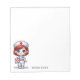This notepad for nurses features a cute manga chibi-style nurse with red hair and blue eyes with a name to personalize. Perfect for a nurse or nursing school graduate. Image generated with AI.