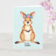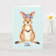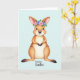 This greeting card features a stylized marsupial centered on a pale blue background, painted with soft, watercolor-like shading for a gentle look 🐰. Its tan fur fades into a creamy belly, with rosy cheeks, bright eyes, and a small upward smile that reads like a friendly hello. A delicate flower crown sits on its head, mixing pink and light blue blossoms with leafy green sprigs, like a sweet gift tucked into the scene 🌷. The animal’s relaxed pose—front paws held close and hind legs splayed—adds an easy, companionable mood, as if it’s waiting to be greeted back. Beneath the character, a short message is placed near the bottom center in a darker contrasting color that stands out against the light background. The open space around the figure keeps the focus on the tender expression and the carefully painted petals and leaves. The final detail is the crown’s tiny clustered flowers, with green foliage peeking between the pink and blue blooms.