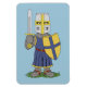 A cute cartoon knight clad in mail and great helm holds his sword high, ready to defend his castle.