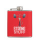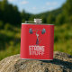 A funny meerkat weightlifter on a vinyl wrapped flask. Use "Personalize this template" to tweak the "STRONG STUFF" text and create a unique, customized gift. An accessory for someone who enjoys a shot or a tot of something potent, featuring a cute cartoon of a skinny meerkat in big shorts, smiling as he effortlessly lifts a huge barbell with one finger. For fans of booze, weightlifting, meerkats and/or working out.