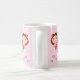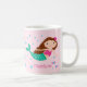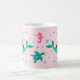 This mug features a cute whimsical mermaid under the sea design with fish, turtle, seahorse and starfish on a pastel pink background. Personalize it with a name.