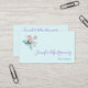 A business card with an adorable illustration. Designed with a pretty mermaid girl riding a happy dolphin. A little jellyfish friend accompanies them. Decorated with little splatters of faux gold glitter. Light blue background.