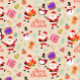 Seamless Christmas pattern with Santa Claus, snowman, penguin, gingerbread man, gift boxes, Christmas balls and leaves on a beige background. The style is cartoonish and colorful.