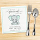 Cute gender-neutral napkins for your baby shower with "A Sweet Little Peanut Is On Its Way" written in soft grey typography and a stylish script with swashes, and a pastel mint green watercolor of a baby elephant. Personalize the mother-to-be's name and shower date in simple grey typography.