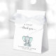 Cute gender-neutral favor gift boxes for your baby shower with "a sweet thank you" written in a mix of soft grey typography and a stylish script with swashes and a pastel mint green watercolor of a baby elephant. Personalize the mother-to-be's name and shower date in simple grey typography.