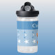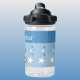 This water bottle features a cute monkey with stars in the colors blue and white.