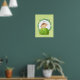 A poster with an illustration of a little monkey peeking out from behind a green bush. Surrounded by a wreath of tropical leaves. Hello written above his head. Set on a green watercolor background.