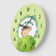 A clock with an illustration of a little monkey peeking out from behind a green bush. Surrounded by a wreath of tropical leaves. Set on a green watercolor background. Personalize with a name in a curved island style font.