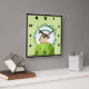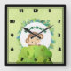 A square clock with an illustration of a little monkey peeking out from behind a green bush. Surrounded by a wreath of tropical leaves. Set on a green watercolor background. Personalize with a name.