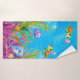 Cute under-the-sea beach towel featuring jellyfish, starfish, sea turtles, and dolphins. Perfect for a nautical ocean-themed kid's bathroom.