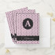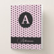 Design features a pink background to a black polka-dot pattern. Front displays the initial you supply in pink lettering against a black oval. Bottom displays name or text in a pink script against a black strip.