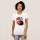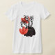 Cute monster women's tee with a black cartoon creature with four eyes on long black and white striped stems smiling, hidden in abstract red tulips.