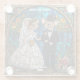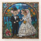 The coaster features a charming stained glass mosaic design of a mouse wedding couple standing under a decorative arch adorned with colorful flowers. The groom, a dapper mouse, wears a tiny black tuxedo with a white bow tie and a small top hat. The bride, a lovely mouse, is dressed in a delicate white wedding gown with a flowing veil, embellished with subtle hints of pastel colors that catch the light beautifully.