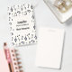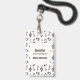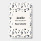 A name tag with a musical themed design. A pattern with treble clef, bass clef and other musical symbols.