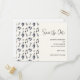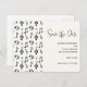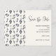 Save the date postcard with a musical themed design. A pattern with treble clef, bass clef and other musical symbols.