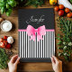 Black and white kitchen tea towel featuring a cute girly pink bow and ribbon on a black and white stripes pattern and personalized white name print.