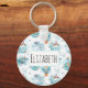 A key chain with a whimsical pattern featuring cute smiling whales happily swimming in the sea.