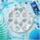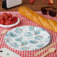 Paper plates with a whimsical pattern featuring cute smiling whales happily swimming in the sea.
