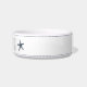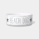 Cute coastal style dog bowl for your beach house or island abode features the words "beach dog" in smoky harbor blue farmhouse style lettering on a white background accented with narrow navy stripes and a pair of starfish.