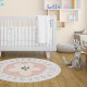 Unique education alphabet ABC typography with boho abstract flower design for your children toddlers in round neutral color rug. Cute way to decorate nursery room for your little one. The color neutral orange , blue, green beachy calm mood.