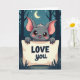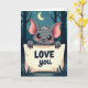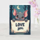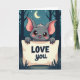 This design shows a sweet night scene with a small grey bat, sitting in a quiet forest. Its big ears have soft pink inner fur, and its wide eyes and rosy cheeks give it a shy, caring look 🥰. The background is a deep teal sky with a thin crescent moon and tiny stars shining above dark tree shapes. The creature holds a creamy banner in its paws right in the center, so your attention goes straight to the message. The text reads “LOVE you,” with “LOVE” in thicker, darker letters and “you” in a smoother, flowing style, all placed across the banner. The calm colors and gentle expression make it feel like a small, honest moment of affection rather than something over the top. It’s a meaningful card to give when you want someone to feel noticed, cared for, and close to your heart ❤️.