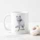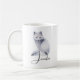 A mug with a watercolor image of a white fox with fancy blue flora designs all over its fur.
