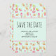 Birthday or baby shower save the date card with a whimsical pattern featuring children's toys and a collection of cute deer, giraffe, bears, and more delightful animals.