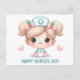 This postcard captures the essence of Nurses Day with its adorable, illustrated nurse character. With rosy cheeks and a cheerful smile, the character is embellished with cute, pink bow-tied pigtails and a crisp nurse's cap adorned with a medical cross. The soothing pastel palette, featuring a soft turquoise uniform and heart accents, adds to the whimsical charm. Emblazoned with the joyful greeting "HAPPY NURSES DAY!" in a playful, matching teal font, this design celebrates nurses' nurturing spirit and their unwavering care.