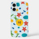 Colorful custom ocean beach collage iphone case with starfish, shells and pebbles, sea weed for summer time features custom monogram. Unique and pretty beach style iphone case design features adorable tropical pattern inspired by the ocean's beauty, adorned with delicate sea shells, starfish, seaweed, water droplets, and pebbles. The bright hues of blues, reds, yellows and greens mimic the colors of the tropical sea and evoke summer vibes. Let the beauty of the coastal beach elevate your every day. Personalize this iphone case with your initial.