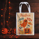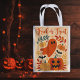 Personalize this cute Halloween Boho Trick or Treat bag with your own text. This bag features an adorable ghost flying over a landscape of pumpkins.