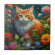 An adorable orange cat with yellow eyes sitting in pretty colorful flowers.