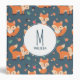 A binder with a pattern made with cute and happy orange foxes. Dark green background. Little mushrooms and leaves sprinkled about. A white circle layered over top with your name and monogram initial inside.