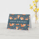 Happy Birthday greeting card with a pattern made with cute and happy orange foxes. Dark green background. Little mushrooms sprinkled about.
