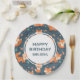 Happy Birthday paper plates with a pattern made with cute and happy orange foxes. Dark green background. Little mushrooms and leaves sprinkled about. A white circle layered over top with your text inside.