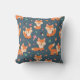 A pillow with a pattern made with cute and happy orange foxes. Dark green background. Little mushrooms and leaves sprinkled about.